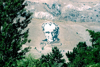 Ну и напоследок очередной привет Ататюрку. На скале неподалеку от Эрзинджана почти 30 лет назад патриотически-настроенный художник нарисовал гигантский портрет Мустафы Кемаля, который виден даже со спутника гугл. Портрет занимает 7500 квадратных метров, на него ушло по сто тонн черной и белой краски, его рисовали 3 тысячи солдат из ближайшей военной части (конечно, солдаты, все как у нас прям)), и работали они 29 дней.