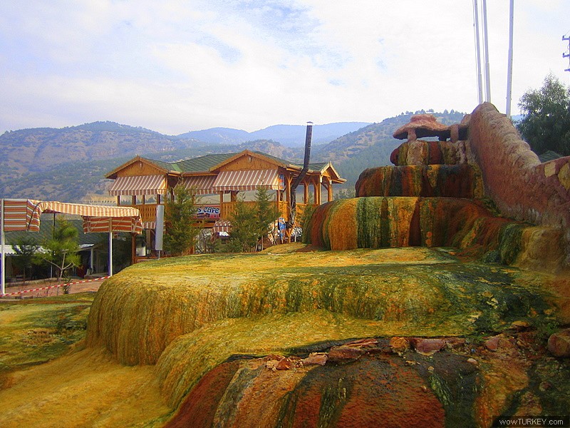 Термальные воды после выхода из источника, избавившись от давления растекаются вокруг: находящийся в составе воды газ улетучивается, известняк оседает на дно и со временем образуют белые, интригующие террасы.